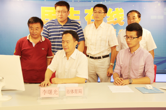 青岛市体育局党委委员、副局长李曙光(一排左一)与网民交流 (周琦 摄)
