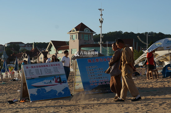30日下午17时许,第一海水浴场的沙滩上,不少的市民和游客享受着初秋的清凉。记者发现,三名假和尚身穿僧袍,每人背着一只口袋,瞅准时机便向路人“念念有词”,同时伸手讨要香火钱。