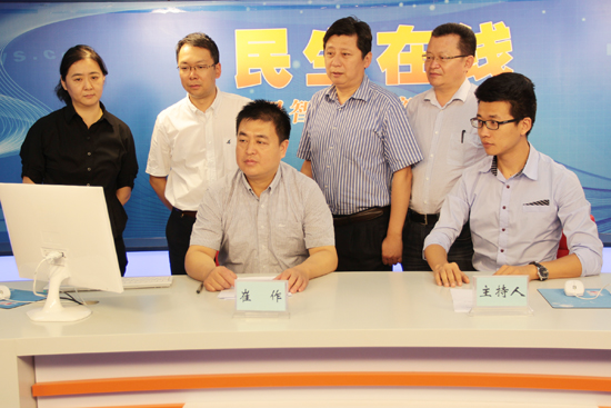 青岛市商务局副局长崔作(一排左一)与网民在线交流 (周琦 摄)