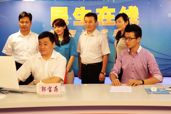 青岛保税港区工委委员郭宝存(一排左一)与网民交流 (周琦 摄)