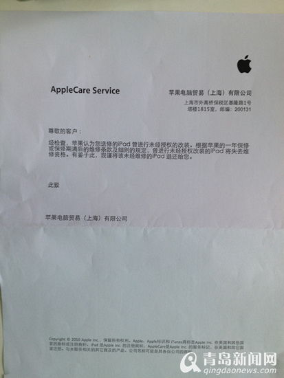 孙先生表示:“2012年12月12日,我在一网上商城购买了一部newipad,花费3226元。今年7月17日时,突然开不了机了,我给苹果售后打电话,他们让我把机器送到苹果在本地的售后网点保修,即百华悦邦青岛店。经过售后检测,对方居然拒绝维修我的机器,原因是此机器有过未经苹果授权的维修,这就意味着,该商城可能卖给我的,是有过维修的机器。”随后,孙先生就此事给该网上商城售后打过了电话,对方表示需要他提供此机器在收货前就有过维修的证明,否则他们将不承担任何保修责任。