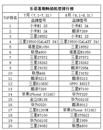 在位列乐语通讯第二季度手机销量排行榜一、二名之后,在7、8月乐语2013暑期手机销量排行榜中,小米2S、2A交替坐上冠军宝座,并一直保持在前三之中。小米手机以高性价比形象深入人心,成为当之无愧的畅销智能手机NO1。而在8月,酷派7269更是代表国产千元智能机登上亚军宝座。