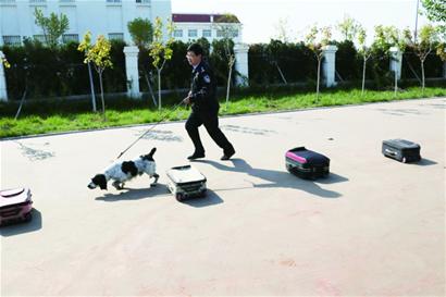 “搜!”只要民警陈磊一声令下,7岁的史宾格犬“蛋蛋”就会匍匐在地面上,卖力地开始搜索,无论是毒品还是炸弹都逃不出它敏锐的嗅觉。昨天上午,为了向记者展示“蛋蛋”的搜毒本领,陈磊把它带到了训练场。“好好表现啊,找到了就给你玩皮球,再吃个鸡蛋。”陈磊一声令下,“蛋蛋”就认真地排查起来,在几个皮箱外围重复嗅了两下,立即卧在了红色皮箱上,这是在“告诉”陈磊它发现了毒品。这次搜毒过程仅仅用了十几秒钟。陈磊告诉记者,“蛋蛋”最初是干搜爆专业的,中途又学习搜毒品,没想到很快进入了状态。
