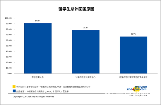 蓝皮书认为:家庭团聚原因是留学生回国的主要原因。其中有90.9%的留学生因为不想远离父母而回国,78.4%的留学生因为对国内职业发展有信心而回国,66.7%因为可以享受更好的文化生活而回国。