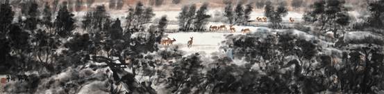 刘兆平来自内蒙古大草原,面对得天独厚的生活环境及创作素材,他并没有坠入草原风景及鞍马人物的窠臼之中,而是心有所向,文思纵横,冥冥之中与长安画派的文脉正途相汇,拜长安画派巨擎方济众为师,从此开始了其长达半个世纪的笔墨探索之苦旅。我们知道,方济众是长安画派的代表性画家,他的创作风格既受其师赵望云质自然、平民化的影响,也受长安画派另一代表人物石鲁的影响,注重笔墨的表现能力的开发。这种双重的影响并没有使方济众的个性消失,而恰恰在巨匠的艺术探索的差异间,他找到了能够使自己的艺术勃然成长的巨大空间:诗情化的自然与表现。这一点对刘兆平的启发可以说是巨大的。