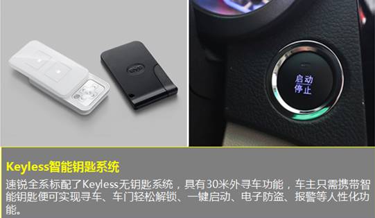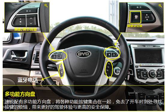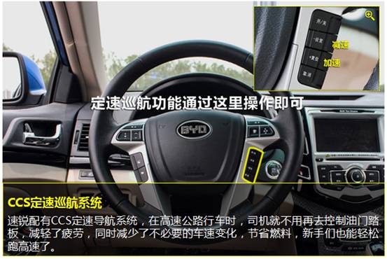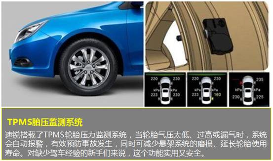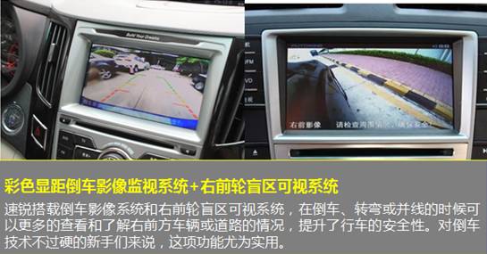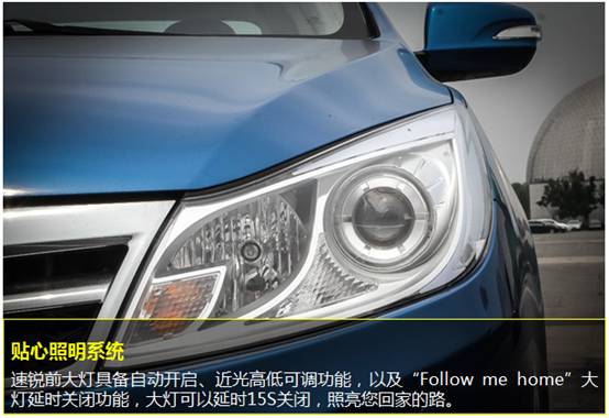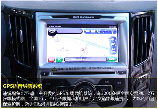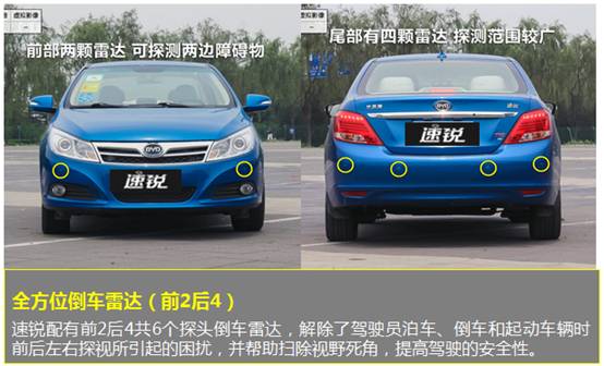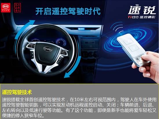 速锐是比亚迪汽车“技术 品质 责任”品牌战略转型后推出的全新车型,集比亚迪在汽车电子方面的多项高端技术于一身,全面超越同级别车型。其配备的全球首创遥控驾驶技术、彩色显距倒车影像监视及右前轮盲区可视系统、Keyless智能钥匙系统、GPS语音导航系统、CCS定速巡航系统、多功能方向盘、先进的照明系统等一系列智能又贴心的驾驶辅助系统,不仅能带给车主愉悦的驾车体验,更能辅助新手们轻松行车。