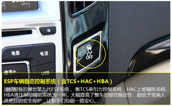 除了上面所提到的驾驶辅助系统外,作为“最安全自主轿车”的速锐还配备了一系列保障安全驾驶的辅助系统,如ESP车辆稳态控制系统、TCS牵引力控制系统、HAC上坡辅助控制系统、HBA液压制动辅助系统等,能帮助新手们从容应对各种突发路况。