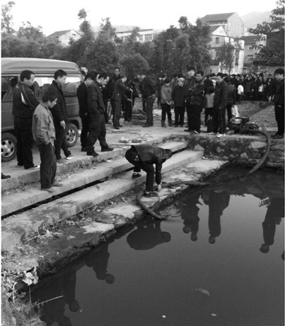 昨天下午,警方在案发点外100多米处的河塘里,寻找黄某某扔掉的凶器。