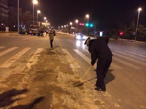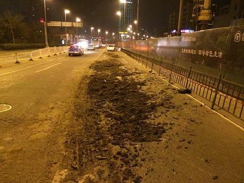 据悉3月1日夜间21时30分,崂山城管执法人员巡查至香港东路麒麟大酒店段时,发现路面出现重大建筑垃圾撒漏,绵延1000多米,宽1-2米,现场却未见肇事车辆。执法人员第一时间设置警示标志,提醒过往车辆及行人注意交通安全,并积极联系相关人员对撒漏的建筑垃圾进行清理,消除存在的安全隐患。