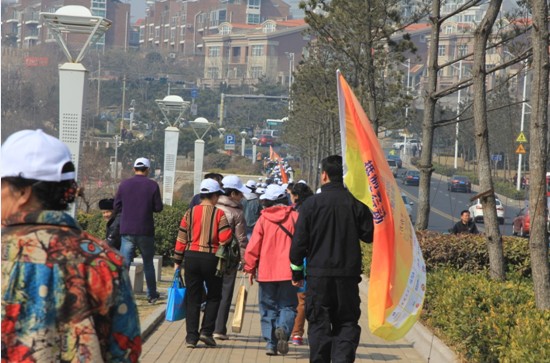早上七点起,陆续有市民来到现场等候活动开始,9点30分,随着主持人宣布健步行的开始,热情洋溢的健步行队伍在旗帜的指引下沿东海中路向燕儿岛公园行进,在行进途中,健步行队伍中不时有对雾霾天气的探讨,到达折返时,由麦岛广场设置的“供水站”为参与的市民提供饮水。