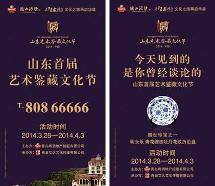 为继续开拓文化之旅之路,同时也为弘扬中华民族传统文化,展示中国古典文化精髓,青岛啤酒地产控股有限公司旗下青啤·颐山源墅项目携手青岛艾达文化传播有限公司于2014年3月28日至4月3日倾力举办山东首届艺术鉴藏文化节,届时将有众收藏名家共聚一堂,近百件亿级稀世珍宝雅集岛城,共襄盛会!