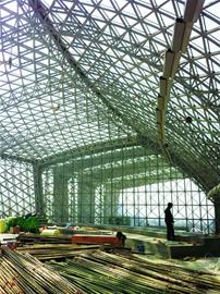 在照明方面,主题馆30%的照明依靠太阳。由于这里内空间大,白天也需要一部分照明,工程采用了“光导照明”,采用特制的光导纤维,把外部的阳光“引入”室内,“引”进来并不需要太阳能的储存和转化,也不需要灯泡,而是直接将太阳光拿到室内来用。
