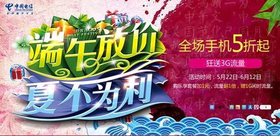 “千载悠悠,成习俗,天中端午。”又一个端午节如期而至。今年的端午节正好和世界杯重合,三天小长假巧遇儿童节。可谓恰逢佳期,山东电信网厅以此为契机,特推出端午节优惠活动,全场手机5折起,电信3G流量狂送不停,让您端午出行不愁话费,随时随地乐享3G。活动时间为5月22日-6月12日,活动期间购乐享套餐加1元流量翻倍哦!下面随小编一起到山东电信网厅逛逛吧。