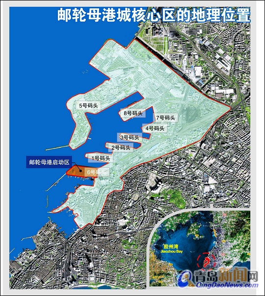 青岛邮轮母港,位于小港湾区域,占地35公顷,总建筑面积约50万平方米,启动区共有三个邮轮专用泊位,包含原有六号码头两个泊位,总长度可达1000米。其中投资8亿元的新建泊位,码头长度约490米,陆域纵深为95米,世界最大邮轮可自由进出,设计年通过能力为60万人次。而在邮轮母港周边将配套建设国际顶级商业中心、游艇码头、休闲中心、星级酒店、SOHO办公区,总投资规模逾千亿。