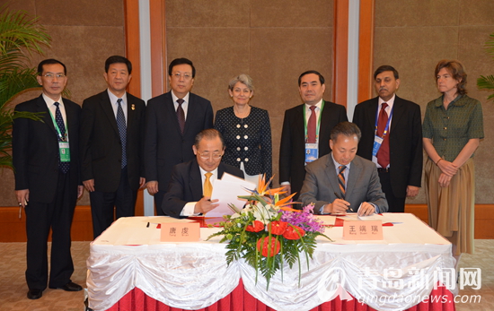 参加签约仪式领导合影留念:联合国教科文组织主席 郝平(左四),联合国教科文组织总干事 伊琳娜•博科娃(左五),联合国教科文组织助理总干事 唐虔(左三),中国联合国教科文组织全国委员会秘书长 杜越(左二),青岛市委常委、副市长 王广正(右三),伟东集团董事长 王端瑞(右二)