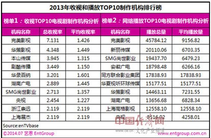 相关数据表明:2013年收视TOP30电视剧的制作机构除了“央视”、“湖南广电”外,其他均是民营制作机构。其中,完美影视表现尤为抢眼。在2013年收视率前30的电视剧中,完美影视凭借《咱们结婚吧》、《陆贞传奇》、《打狗棍》、《小爸爸》、《老有所依》占据5席,位列第一阵营。而综合电视台收视率与网络播放看,在TOP30的剧目中,完美影视的总收视率和播放总量均排名第一,超越传统的业内“大佬”,成为名副其实的中国影视剧“一哥”。
