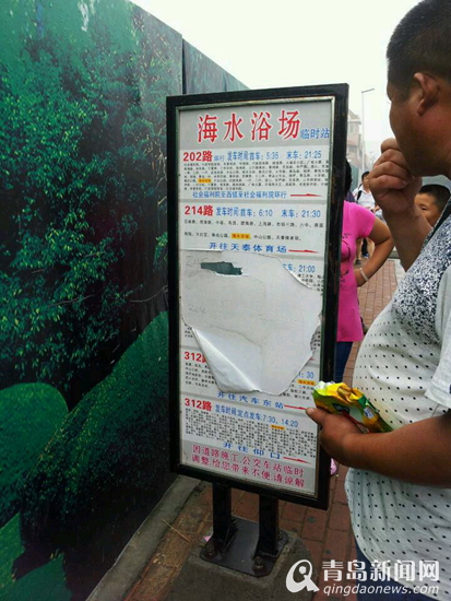 2014年7月23日,本网记者接到市民王先生(化名)反映,他表示在他陪外地朋友游览青岛海边风光时,偶然发现位于“海水浴场”一站的临时公交站牌被损毁严重,导致连他在内的不少乘客“找不着北”。