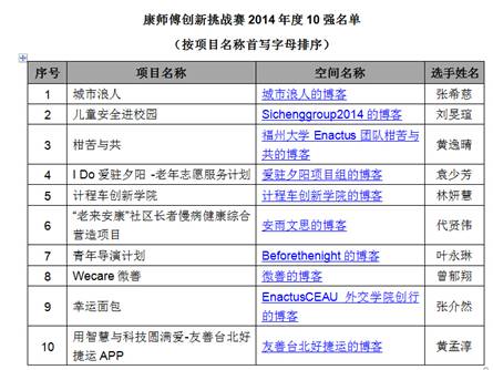近日,“创响新生代”康师傅创新挑战赛全国四十强选手在经过为期三天的公益训练营及复赛答辩后,最终决选出 “康师傅创新挑战赛全国公益十强”,入围的选手来自广东、福建、北京、江苏及台湾。本届康师傅创新挑战赛十强选手大部分为90后在校大学生,他们的提案内容涉及环境保护、扶农、儿童教育、文化传播、弱势群体关爱等,关注的服务对象从普通的社区居民到残障人士、儿童、失独老人,展现出90后欣欣崛起的青年公益力量。