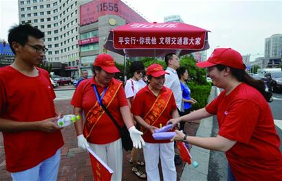 昨日,68岁的张纯在香港中路与福州路路口引导着市民文明安全地通过绿灯。“我家在沧口,每天早上7时左右到路口上岗。”张纯说,为了能够尽早到达路口上岗,她每天早上4时多就起床,5时40分出门坐公交车。“春秋还好说,夏天早上很早就晒得不行了,下午高峰期的时候也很热,出门时自己带的一杯白开水根本就不够。”张纯说,为了补充水分,除了公共文明引导志愿者相关部门送来的水,他们还到附近的银行、饭店去打水喝。“除了张纯是沧口的,还有崂山等地的也要一早就出发来上岗。”市南区公共文明引导志愿者大队长宋乐玉介绍说,市南区一共有300名公共文明引导志愿者在主干线各个路口上岗。