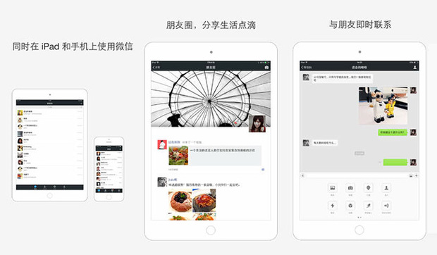微信 5.4 还新增了对 iPad 平板电脑的支持,总有那么一些用户,如对屏幕有偏好的设备的长辈、采用功能机与 iPad 搭配的学生、或者喜欢一边看电影一边刷朋友圈的白领,他们希望能够在大屏幕设备上面使用微信。