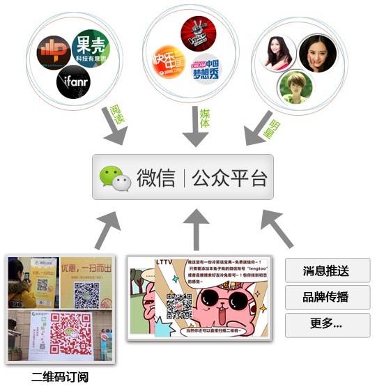 大众用户可以通过微信的公众帐号搜索添加,扫描实体店,网站上的二维码添加公众帐号。此举无疑是对新浪微博进行十分有效的狙击。在PC端腾讯一直没有找到良好的方法摆脱低龄,媒体价值低等品牌印象。在移动端腾讯看来要通过公众帐号吸引明星、学者,各行业佼佼者的加入。培养出一个移动的内容中心,最终以内容盈利。