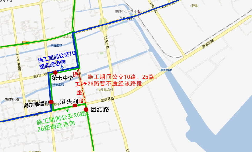 自北向南经团结路、渭河路、奋进路、前湾港路到达团结路后恢复原线路运行,临时增设第七中学、海尔幸福里、港头刘3处站点,暂不途经青岛育仁医院西站。发往陈家庄(龙泉王家)方向的25.26路公交车,原团结路站现停靠团结路与前湾港路路口南侧的15路站。