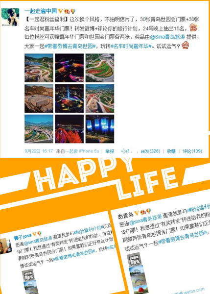 9月22日—9月24日,新浪青岛联合微博大V回馈粉丝,“名车&时尚嘉年华”门票免费送!知名旅行撰稿人@一起走遍中国、青岛全搜索旅游主编@椰子joss、知名媒体人@恋青岛等大V一起大送福利,“名车&时尚嘉年华”门票+世园会门票,等你来拿。