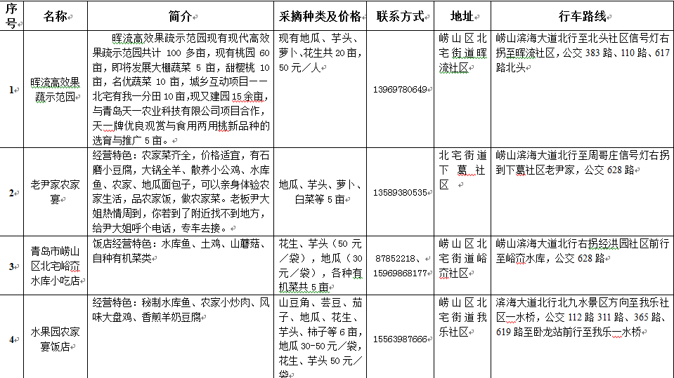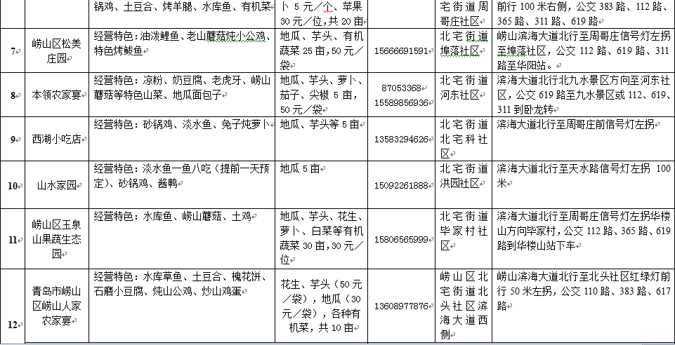 1.花花浪森林公园。位于崂山巨峰支脉人头崮西坡之谷地,于2005年被批准为市级森林公园,具有丰富的森林旅游资源和生态资源,是一处集森林公园、森林探险、林业科普和生态观光于一体的自然生态旅游区。现在欢迎市民免费游览,市民可乘坐110路公交车至北头社区,或驾车沿滨海大道至北头社区顺路线游览。
