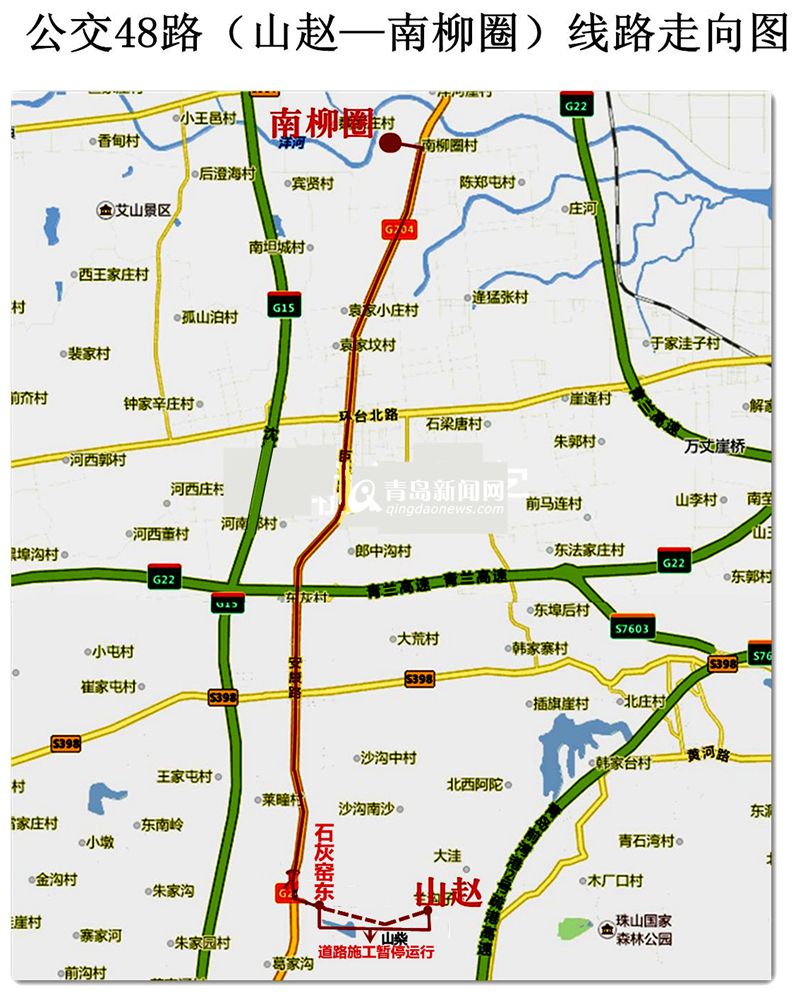 据悉:48路车由山赵发车经山柴和石灰窑乡村道路、204国道到达南柳圈村,共设站点23处:山赵、山柴、石灰窑东、石灰窑、殷家台、姜家屯、沙沟、黄山、亚东集团、小王家庄、西灰、东灰、河南薛、王台中心中学、富鳞国际、大观园、邮电局、董城、高山华府、袁家小庄、大朱阳西、西漕汶、南柳圈。该线路实行无人售票,全程票价一元。