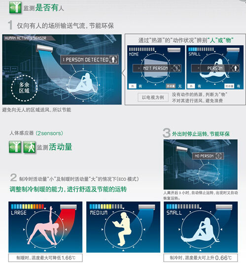 先进的感应器技术成为ECONAVI节能导航功能的核心,可以感知是否有人以及人所在的位置,向人所在的位置定向送风,人离开3小时后自动停止运转;还可以按照活动量进行差异化送风,自动调节风量和压缩机频率。ECONAVI节能导航提升了空调送风的智能化程度,做到智能探测、智能计算、智能送风,从而达到舒适和节能两不误的效果。
