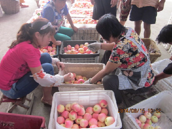 二、 现在合作社拥有2400亩无公害苹果生产基地500亩绿色食品苹果基地和100亩有机苹果基地,位于山东半岛的平度市东北山区-旧店镇。这里特殊的地理环境,土壤环境,气候特点及其适宜苹果生长。生产的苹果有早、中、晚熟三个系列10多个品种,主要品种有嘎啦、乔纳金、黄金帅、新红星、红富士等,合作社所生产的产品全部用双层套袋技术,严格按照标准化生产,年产无公害苹果及绿色食品苹果和有机苹果7500余吨,苹果果形端正、色泽艳丽、甘爽多汁、香气浓郁。所产苹果的糖度在14.5度左右,硬度在6-8个,指数0.85左右。2007和2008年合作社生产的红富士苹果分别获评青岛优质农产品、特优产品称号和青岛市“一村一品”公信优质品牌食品,被评为青岛市无公害示范基地、生态园基地、农产品质量安全工作先进单位。2009年旧店牌苹果被国家认定为绿色食品同时也获得了农产品地理标志保护的认证,2010年旧店苹果被青岛市评为名特优农产品荣誉称号2011年旧店苹果被评为青岛市著名商标。2012年6月荣获山东省著名商标,2013年十一月先后被评为青岛市和省喜爱的农产品;是旧店”苹果在海外市场尤其是新加坡、马来西亚等东南亚市场上都有一定的知名度,在欧洲市场上也有旧店苹果的身影,合作社将在东南亚市场作为重点开拓目标,打开了合作社通向海外市场的绿色通道。