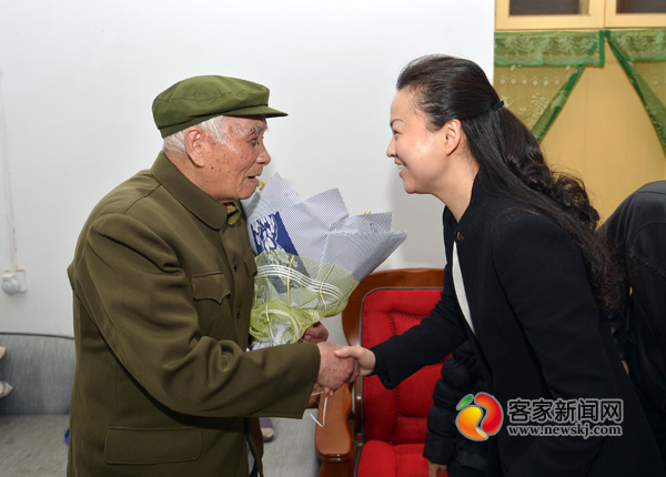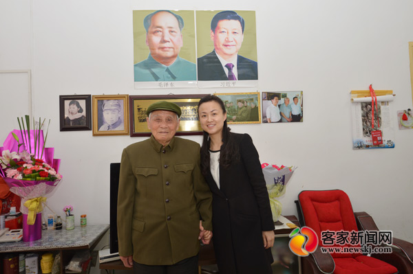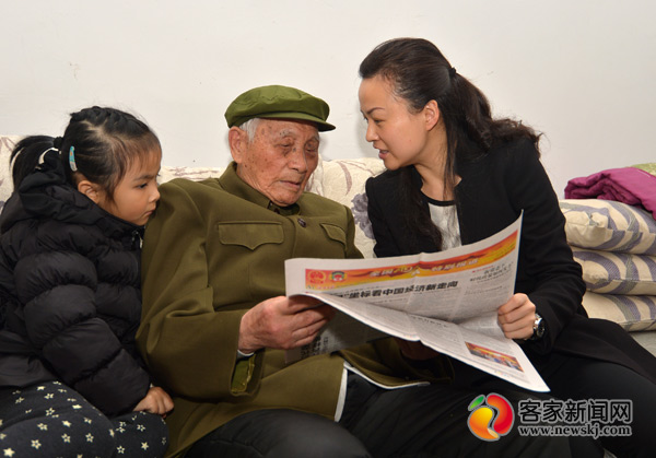 明经华向王老汇报“两会”盛况,并转达习总书记对赣南老红军的祝福和对老区人民的深切问候。记者何敏 摄