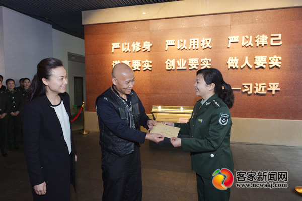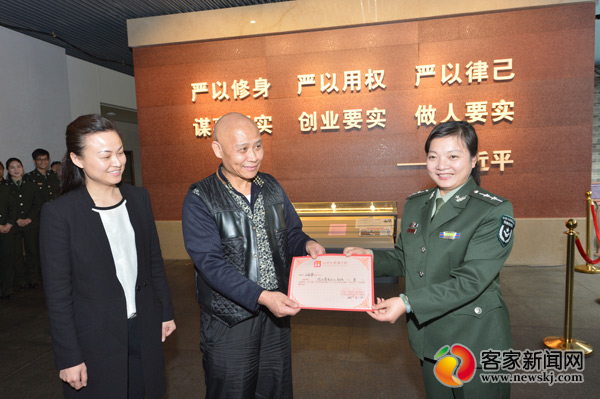 苏区干部好作风陈列馆工作人员向王承登的儿子王建国颁发收藏证书。记者何敏 摄
