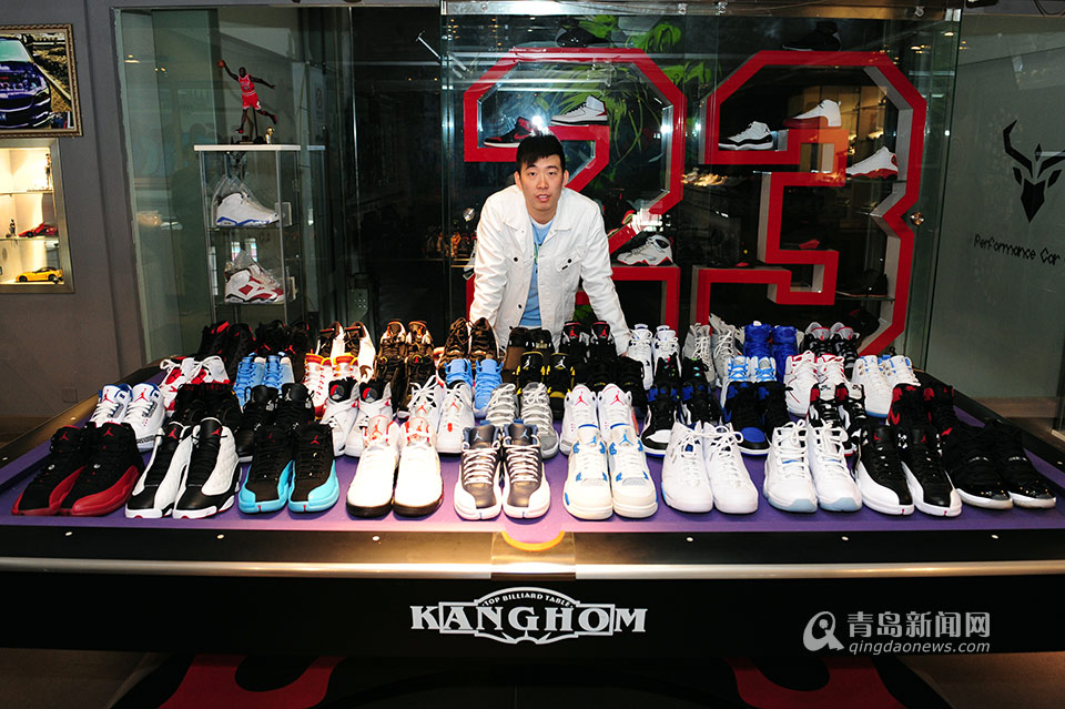 青岛新闻网4月15日讯 英文里有一个单词“Sneaker”,其原意是“胶底鞋”,广泛意义为“运动鞋”。如今,独特的鞋文化造就了一批热爱和收藏球鞋的人,这些人同样被称为“Sneaker”。在青岛,有位85后小伙就是一个狂热的“Sneaker”,他用10年时间,收藏了100多双乔丹篮球鞋,其中不乏罕见的限量版球鞋和价值不菲的乔丹签名版球鞋。而最近,他将携藏品在自己的车行里办一次球鞋展。