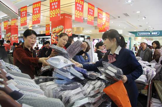 在崂山百货一楼特卖区,笔者看到一大波顾客正围在门口的花车抢购衬衣。导购员一边耐心的解答顾客的询问,一边不停的为顾客找货、递货。崂百营运部部长史延功告诉笔者,“因为季节、小长假等客观原因,再加上衬衫的价格确实是实惠到顾客心里去了,这两日到店内选购衬衫的顾客非常多”。另外史部长半开玩笑的说到“最近流行的跑男综艺节目绝对拉动了运动鞋的销量,在五一期间崂山百货顺势推出新百伦全场85折活动,这是新百伦在李村商圈内搞的第一次折扣活动,百伦粉丝们又能享福啦。”