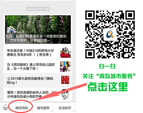 作为岛城首个微信导航网站,我们旨在为大家提供最专业、最权威的服务。您可以关注“青岛城市服务”微信公众账号,在底部菜单栏“微信导航”里找到我们。当然,如果您想免费加入我们或者与我们寻求合作,欢迎拨打电话0532—68873209联系我们。