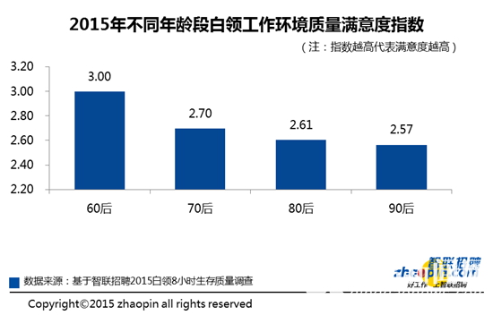 2015白领工作环境满意度指数仅为2.59;90后最看重工作环境,且对目前的工作环境满意度最低。