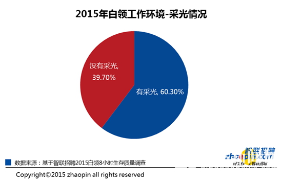 那么白领在工作环境中不满意的地方在哪里?总体来看,六成白领的工作环境中有采光,采光状况相对的较好。自然采光不足的情况可以通过日光灯等其他方式补足。