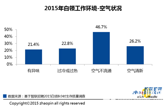 空气流通方面,仅有26.2%的白领表示空气清新,空气状况良好。近一半的白领表示空气不流通,22.8%的白领表示温度过冷或过热,另外有2成的白领表示空气中有异味。现代办公楼大多采用中央空调,空气和温度统一管理,因此空气状况整体较差。