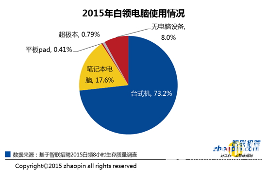 随着中国飞速进入了“互联网+”时代,白领的办公体验如何?是否享受到了变革的便利?智联招聘本次调查发现,73.2%的白领工作中使用台式机,配备笔记本电脑的比例仅为17.6%,还有8%的白领没有配备电脑设备。此外,超级本、平板Pad的配备比例非常低,分别只有0.8%和0.4%。由此可以看出,对企业雇主来说,还有很大的空间可以通过将办公设备更新为移动性更好的笔记本电脑来提升员工的工作效率,进而提升企业的整体竞争力。