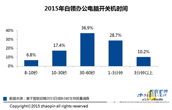 智联招聘本次调查发现,24.1%的白领开关机的时间在30秒以下,36.9%的白领开关机时间在30-60秒之间,近四成白领的开关机时间超过了1分钟。