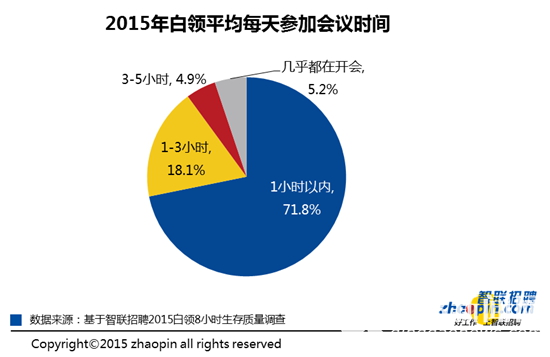 开会是白领的日常工作中必不可少的内容,开会时间的长度也是影响白领工作状况的重要方面。智联招聘本次调查发现,七成白领平均每天参加会议的时间都在1小时之内,18.1%的白领每天参加会议上的时间在1-3小时。此外,4.9%的白领表示自己每天参加会议的时间在3-5小时之间,有5.2%的白领表示自己一天的工作时间几乎都在开会。