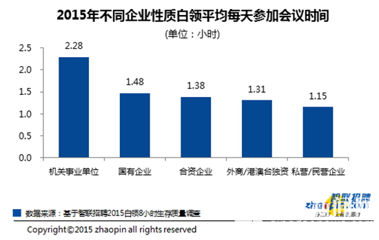 不同企业性质的白领平均每天参加会议的时间差异较大,机关事业单位平均每天参加会议的时间最长,为2.28小时;其次为国有企业,平均为1.48小时。私营/民营企业的白领平均每天参加会议的时间最少,平均为1.15小时。