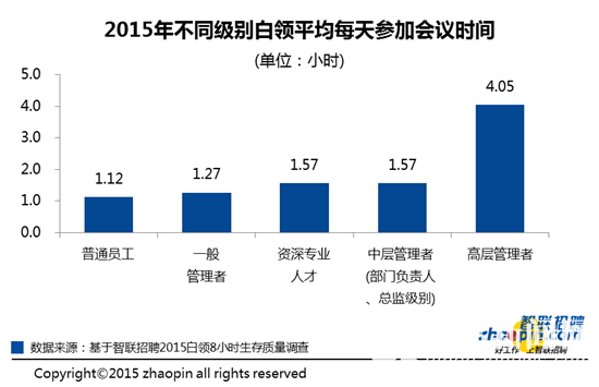 级别越高,每天参加会议的时间越长,高层管理者平均每天参加会议的时间为4.05小时,为每天正常8小时工作时间的一半。资深专业人才和中层管理者平均每天花在会议上的时间为1.57小时,普通员工每天参加会议的时间最少,仅为1.12小时。