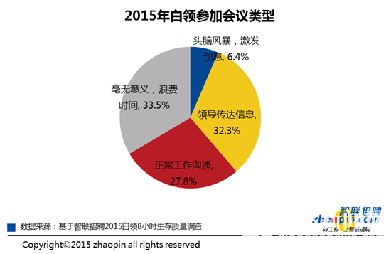 三分之一的白领认为参加的会议大部分毫无意义,是浪费时间。32.3%的白领参加的会议主要内容为领导传达信息,只有27.8%的白领参加的会议主要是正常的工作沟通,另外6.4%的白领参加会议主要为头脑风暴,激发创意。