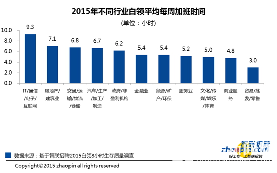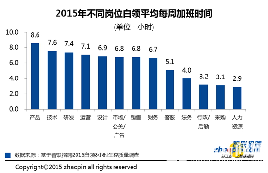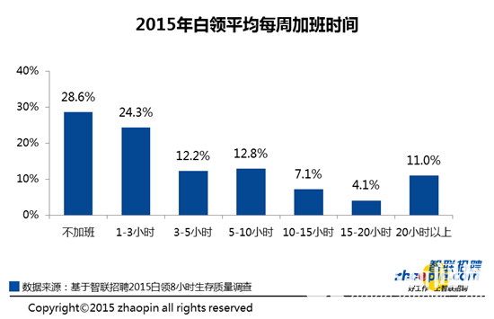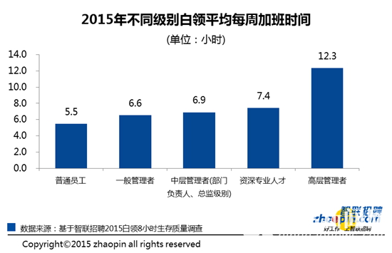 白领级别越高,加班时间越长。智联招聘调查显示,高层管理者平均每周加班时间为12.3小时,其次是资深专业人才,平均加班时间为7.4小时/周。普通员工平均加班时间相对最少,为5.5小时/周。