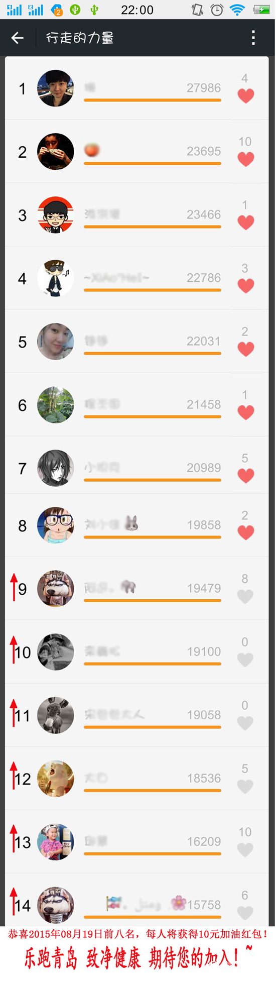 这一天,活动参与收获了不少“爱跑一族”的欢迎,而每天10元的“加油红包”也已安心送至前八强的口袋中,具体参与情况如下: