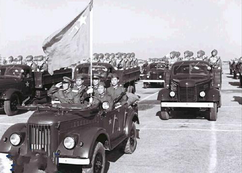 2、受阅部队乘坐第一批出厂的国产解放牌汽车。