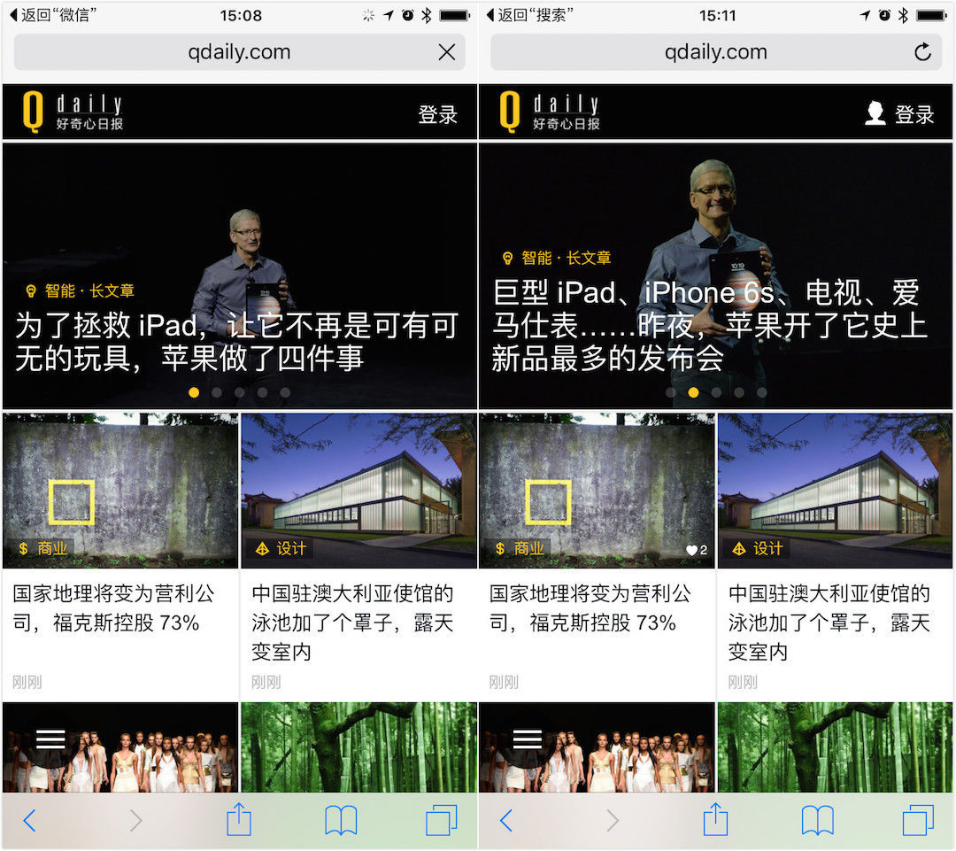 而 iOS 9 用户则能瞬间回到之前的应用。看上图的左上角,是不是开心坏了!