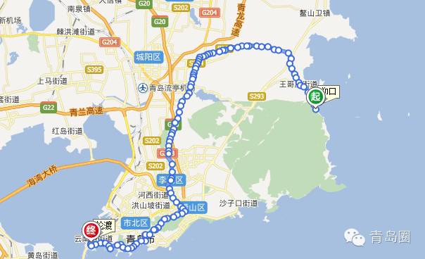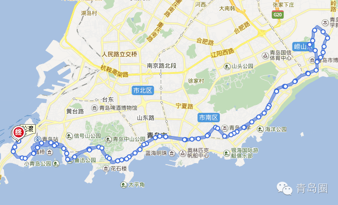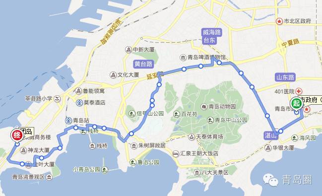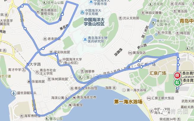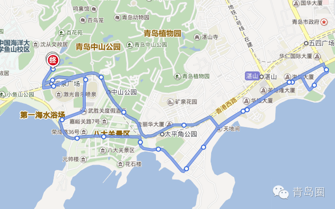 沿途景点:中山公园、汇泉广场、一浴太平角公园、天地间、八大关、三浴、音乐广场、五四广场等。